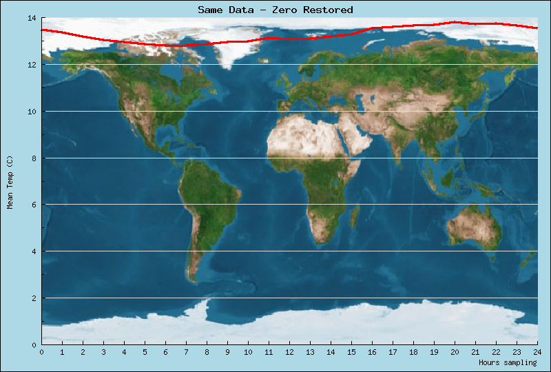 We have superimposed our temperature track over the world map so that the temperature track crosses the map at local noon. It looks very impressive to have such an apparent variation around the globe but that is an illusion of graphing style. The absolute range of sampled mean temperatures was 1 ºC (12.78 ºC – 13.78 ºC) and the day’s mean was 13.27 ºC (this was sampled Saturday, April 9, 2005 and we are working in GMT.) This is what it looks like with the Y axis restored to zero-base (filling in the “missing” portion):