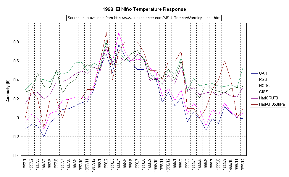Depicted in the adjacent graphic is Earth's response to the 1997/98 El Niño event. These are anomalies and several of the datasets produce anomalies with reference to different base periods but that is of no particular interest here -- only the synchronous warming and subsequent cooling depicted in the atmospheric series (UAH and RSS satellite, HadAT radiosonde balloon) and near-surface land and sea surface datasets (NCDC, GISS and HadCRUT3) of ~0.9 and ~0.5 K respectively.
