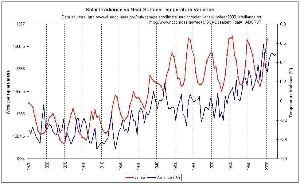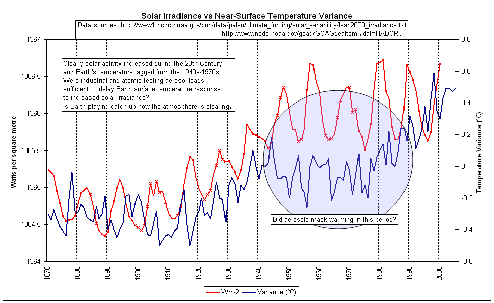 So, while the solar irradiance/temperature variance fit is not entirely compelling it is a significant improvement over that of temperature/atmospheric carbon dioxide. There are, of course, other potential anthropogenic influences on global mean temperature, although the net sign remains unknown of such changes as albedo (Earth's reflectivity) resulting from land use change, humidity and cloudiness in response to plant transpiration changes from broad scale agriculture and irrigation. Then there's changing particulate loads and aircraft exhaust affecting cloud abundance, altitude and type, etc., to name but a few. It could be that these other anthropogenic effects tend to cancel each other out, leaving a net total change of zero, we just do not yet know enough to quantify everything. Always assuming the estimated warming of + Where does that leave us?On the matter of Earth's recent climate history, it is implausible that despite variance in solar irradiance Earth has had a stable temperature for the last 1,000-2,000 years. History instructs us this is not so, literature tells us this is not so, and a large spectrum of paleotemperature reconstructions tell us this is not so. USA Today and the hokey "Hockey Stick" representations are obviously wrong, regardless of how politically correct their concept of human culpability might be. Regarding whether Earth has really warmed to some extent, regardless of our ability to accurately determine it? Yep, we have no problem with that. We have seen nothing compelling regarding Earth's current suspected temperature trend being anything extraordinary nor alarming but we have no reason to believe Earth's mean temperature is not changing, or that it does not do so continuously -- frankly, temperature stasis is a myth. Does increasing carbon dioxide affect Earth's mean temperature? Yes, although probably only trivially and to a declining extent. Note that Professor Pielke, Sr., is firmly in the camp of believers in anthropogenic global warming but freely admits carbon dioxide to be a less-than-critical factor necessitating obsession and, despite somewhat bizarre claims of Professor Lindzen being a "hired gun" and paid-for shill of an alleged "Big Oil" conspiracy, he is a senior and well-respected pure scientist who gleefully admits carbon dioxide's role in enhanced greenhouse, although he does point this out to be trivial and does not subscribe to the planetary emergency scenario. Pielke and Lindzen are no orphans since most so-called "skeptics" similarly point to anthropogenic climate influence as interesting effects to be understood without necessitating hand-wringing and hair shirts. Increased solar activity? Absolutely and at least half of Earth's estimated mean temperature increment since the Nineteenth Century can be attributed to increased solar irradiance, probably more than four-fifths is from that source although we are still trying to sort out climate and forcings, something which will likely require decades yet. Nonetheless, the best available thermometric temperature records list Earth's global mean temperature as variance from a commencing benchmark average, usually 1951-1980 or 1961-90, and show -0.3 °C c1880 or 1870, with 0.0 °C variance from this average occurring c1940 and with 2000 listed as +0.3 °C. In other words, Earth warmed 0.3 °C from origin of record to benchmark average by 1940, then warmed another 0.3 °C subsequently. Since the vast majority of the carbon dioxide increase in the atmosphere occurred following the Second World War and this is concurrent with only half the apparent temperature increase, the assumption is that this increase was driven by some other cause, in this case the increase in solar irradiance. There is no reason to believe all other temperature varying forces ceased to exist when carbon dioxide began accumulating, hence the "at least half" attribution above. Are we looking at a looming disaster from carbon dioxide emissions? There is absolutely zero indication of that. Although human emission of carbon dioxide has likely had some measurable effect on planetary temperature the effect from continued emission is rapidly diminishing as radiative windows in which carbon dioxide is active approach saturation. Before long carbon dioxide emission will have exactly no discernable effect on global temperature. Can we have significant effect on global temperature trend by limiting future carbon dioxide emission? No -- no equivocation and no argument entertained, allusion to "control" of the planetary thermostat by tweaking minor parameters is a nonsense. Do we face a planetary emergency precipitated by carbon dioxide emissions? No, there is zero evidence that such a scenario might be true. Are we personally troubled by carbon dioxide emissions? No. Do we believe a warmer world would be worse than a cooler world? No, quite the reverse since a cooler world would make feeding the current population significantly more difficult, far more so the anticipated increasing population of the next generation or so. If there is to be a change in global mean temperature then warmer is distinctly preferable to cooler. Frankly USA Today have made a nonsense of "global warming" and we don't know what planet Ozone Al is on but he apparently has no idea about this one or its climate. As always, we need to adapt and protect ourselves from the natural environment and that will take more than shouting to frighten away the thunder, as our distant ancestors apparently did. Fortunately we are continuing to master our built environment while increasing productivity to leave more room and resources for wildlife and wild habitat, something only increased productivity can do in the face of increasing human population. Of course, increasing productivity relies both on abundant, affordable energy and abundant carbon dioxide. There are no apparent looming shortages of either, provided we don't do anything stupid. Suddenly affecting lemming-lik