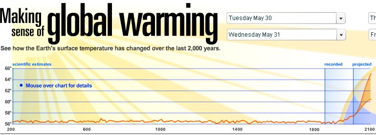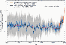 The National Academies convened a committee this year for the project Surface Temperature Reconstructions for the Past 2,000 Years: Synthesis of Current Understanding and Challenges for the Future with the express purpose of trying to sort out what we do and can know of past temperatures. From reports of observers present when paleoclimatologists presented to the committee, we know that presenters were asked if they could reconstruct temperatures from a thousand years ago to within 0.5 °C (0.9 °F). All apparently denied such ability with the exception of Mike "Hockey Stick" Mann, who claimed a precision of 0.2 °C (0.36 °F). Those of us who spend much time fossicking amongst raw data looking for clues to past temperatures tend to greet such claims with an indulgent smile and something like: "Sure Mikey, sure..." but that's his claim. Returning to USA Today's interactive graphic, they present a near flat line representation of some 16 centuries, supposedly accurate to one ten-thousandth of a degree Fahrenheit. While Mann's claim of ±0.36 °F precision elicits polite disbelief the depiction by USA Today causes the forcible suppression of Gore debating-style sighs. Nonetheless, this depiction is now widely proliferated in the public domain and emphatically depicts Earth's temperature as stable until about 1850, following which all estimated warming occurred.