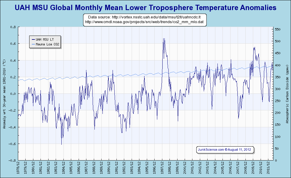 The adjacent graphic is from the decade-old (and pre-PC) The Little Ice Age and Medieval Warm Period in the Sargasso Sea - "Sea surface temperature (SST), salinity, and flux of terrigenous material oscillated on millennial time scales in the Pleistocene North Atlantic, but there are few records of Holocene variability. Because of high rates of sediment accumulation, Holocene oscillations are well documented in the northern Sargasso Sea. Results from a radiocarbon-dated box core show that SST was ~1 °C cooler than today ~400 years ago (the Little Ice Age) and 1700 years ago, and ~1 °C warmer than today 1000 years ago (the Medieval Warm Period). Thus, at least some of the warming since the Little Ice Age appears to be part of a natural oscillation." (Lloyd D. Keigwin, Science, 274: 1503-1508) The Center for the Study of Carbon Dioxide and Global Change is currently engaged in their Medieval Warm Period Project, documenting "the magnitude and spatial and temporal extent of a significant period of warmth that occurred approximately one thousand years ago. Its goal is to ultimately provide sufficient real-world evidence to convince most rational people that the Medieval Warm Period was: (1) global in extent, (2) at least as warm as, but likely even warmer than, the Current Warm Period, and (3) of a duration significantly longer than that of the Current Warm Period to date." We happen to find historical accounts and proxies indicating climatic variation rather more compelling than assertions of millennia-long climate stasis. Nonetheless we will work with such scenarios as we attempt some quantification of the drivers of global temperature change. Regarding contemporary global mean temperature change, is it plausible, even likely, there has been a change of around a half-degree Centigrade since the Industrial Revolution? The short answer is "Yes". The long answer is "Yes, certainly. There is nothing apparently unusual nor alarming about small shifts in global mean temperature. We are only talking about 0.2% change in Earth's mean temperature of 288 K and we are pretty sure increased solar irradiance accounts for a goodly portion of that change." Is carbon dioxide the culprit?