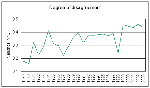 We told you in the JunkScience.com feature The Atmosphere and Enhanced Greenhouse - What's Going On?, that there are multiple datasets in use by varied investigators trying to evaluate the Earth's mean temperature trend(s). We provided links to the MSU digital data used to generate the Lower Troposphere temperature anomaly graphs linked above and also to GHCC items on MSUs and the mutual validation of radio-sonde balloon data with that derived from these "thermometers in space." That so-diversely derived datasets are mutually validating inspires some confidence in their veracity. That MSUs cover such a large proportion of the globe and do so in the well-mixed atmosphere rather than immediately adjacent to confounding influences merely increases that confidence.