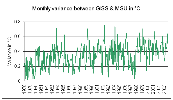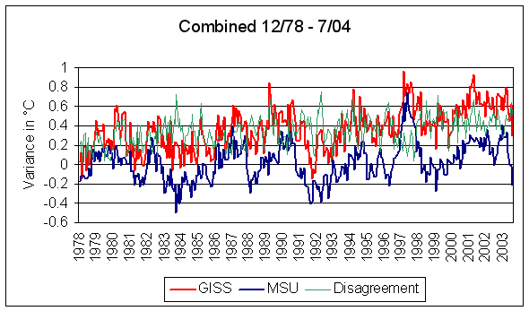 Of course! They are the growing disparity between the MSU dataset and the GISS near-surface temperature amalgam. Here they are on common graphics: