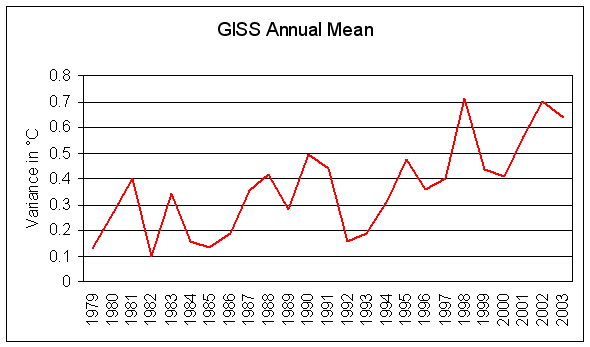 To return to our Pop Quiz, what has all the above got to do with our unlabeled graphs? Nothing... and everything. Firstly, our mystery graphs are not representations of the GISS dataset, which plotted over the same timeframe as our MSU graphs looks like this for the monthly mean: