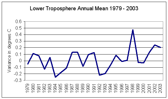 There's one outstanding feature on this graph - the obvious response to the powerful 1997/98 El Niño event. Latest available global mean temperature anomaly was July, 2004 of -0.213 °C. The El Niño temperature spike really stands out on the annual mean temperature anomaly graph for the lower troposphere, which looks like this: