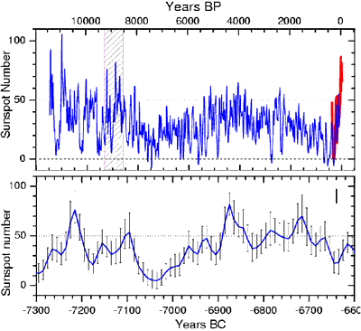 Figure at right - Top: Reconstructed sunspot activity (10 year average) for the last 11,400 years based on C-14 data (blue curve)