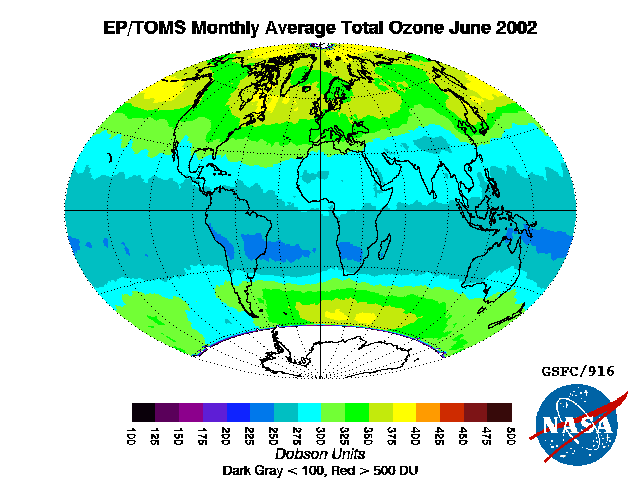 The table below contains thumbnail graphics of global monthly average ozone levels derived from Earth Probe TOMS. Click on the thumbnail to load a copy of NASA's original 640 x 480 image in .gif format. The date range covers all available EP-TOMS data and the months highlighted here are arbitrarily chosen as quarterly from September (greatest Antarctic Ozone Anomaly, incorrectly described as "the ozone hole" by the press, actually a localised seasonal reduction).