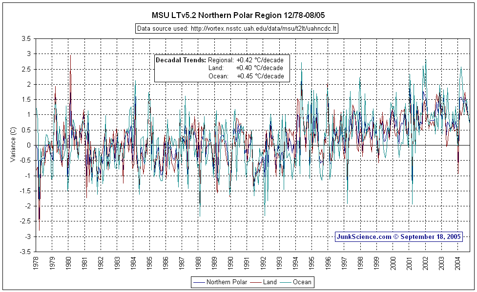 More on Arctic Sea Ice - The news media releases on Arctic sea ice continue, with caveats buried deep in the articles, if at all. An example of the latest release is from the BBC on September 28th entitled “Arctic ice ‘disappearing fast’.” No mention is made of the need to reconcile the National Snow and Ice Data Center (NSIDC) Arctic sea ice information with that of the University of Illinois data (see http://arctic.atmos.uiuc.edu/cryosphere/IMAGES/current.anom.jpg for their analysis of long-term trends). The University of Illinois shows the largest negative deviation from the long-term average in 1995. There is no question that there is a long-term decline in areal coverage (since 1973, as we have also documented in Pielke et al. 2003 , which is the time period we have reasonably robust areal coverage data from satellites), and that human